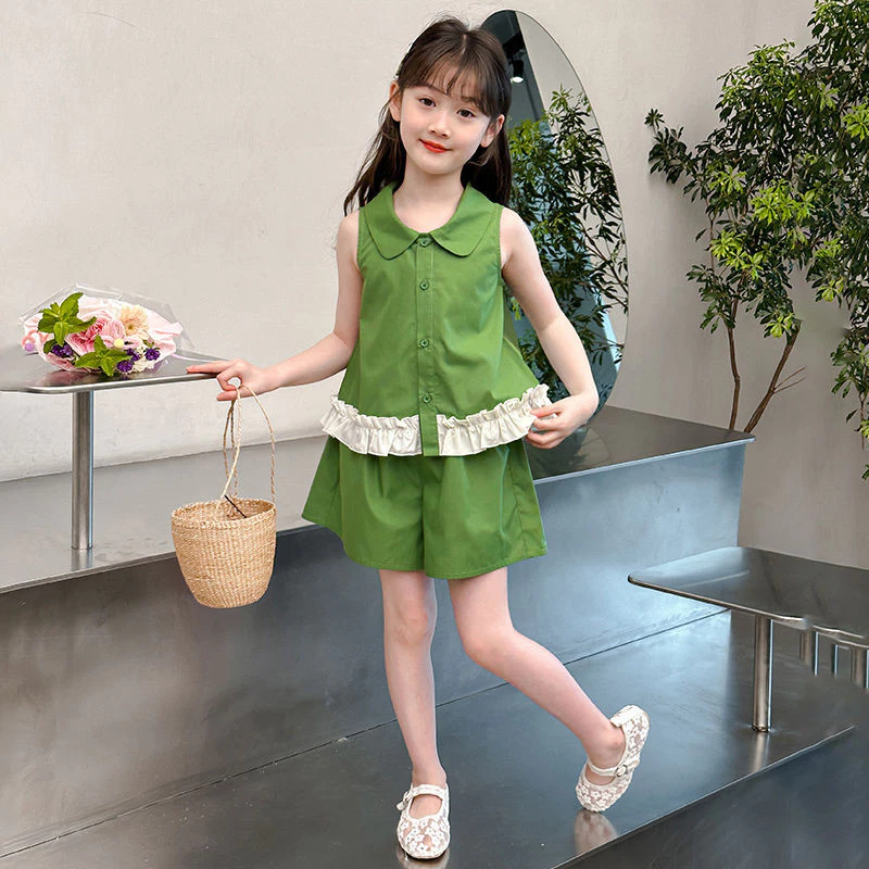 กางเกงขาสั้นแขนสั้นลําลองแฟชั่นสไตล์บางสําหรับเด็กผู้หญิงชุดสองชิ้น ความสูงที่แนะนำ (120-130 ซม.)